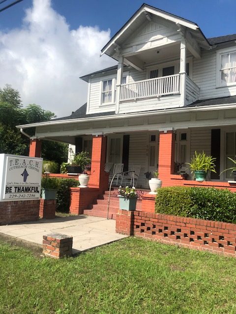 The home now “TEACH Transitional Home” has (8) bedrooms in which the largest 6 are used for residential living, (1) for office space, and (1) for maintenance of a closet for residents. There is one full-size bathroom on the first floor and a full-size bathroom area for the second floor (shower only). The home has a large multipurpose area with a kitchen and dining area on the first floor. A room has been added to serve as a food pantry for residents’ families. There is a large wrap-around porch with an ample yard for parking and small group activities.